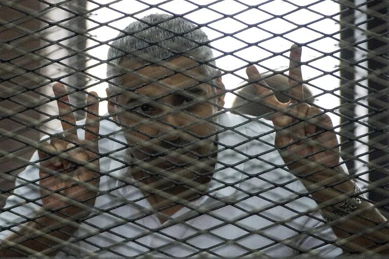 Al-Jazeera's Egyptian-Canadian Mohamed Fadel Fahmy at his trial for allegedly supporting the Muslim Brotherhood June 23, 2014 (AFP)