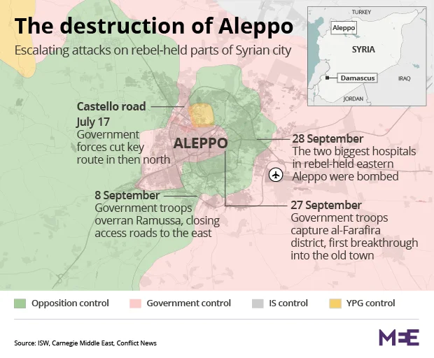 “I think the siege will continue and the regime will keep making daily attacks on eastern Aleppo,” Mohamed told Middle East Eye. “But while he [Assad] might recapture some areas now or in the future, he won’t be able to take the whole city. The rebels will be able to stay in a position to defend parts of the city, and the urban nature of Aleppo [where many buildings are close together] means they will be able to defend the city more easily than we have seen in less urban areas like Daraya.”