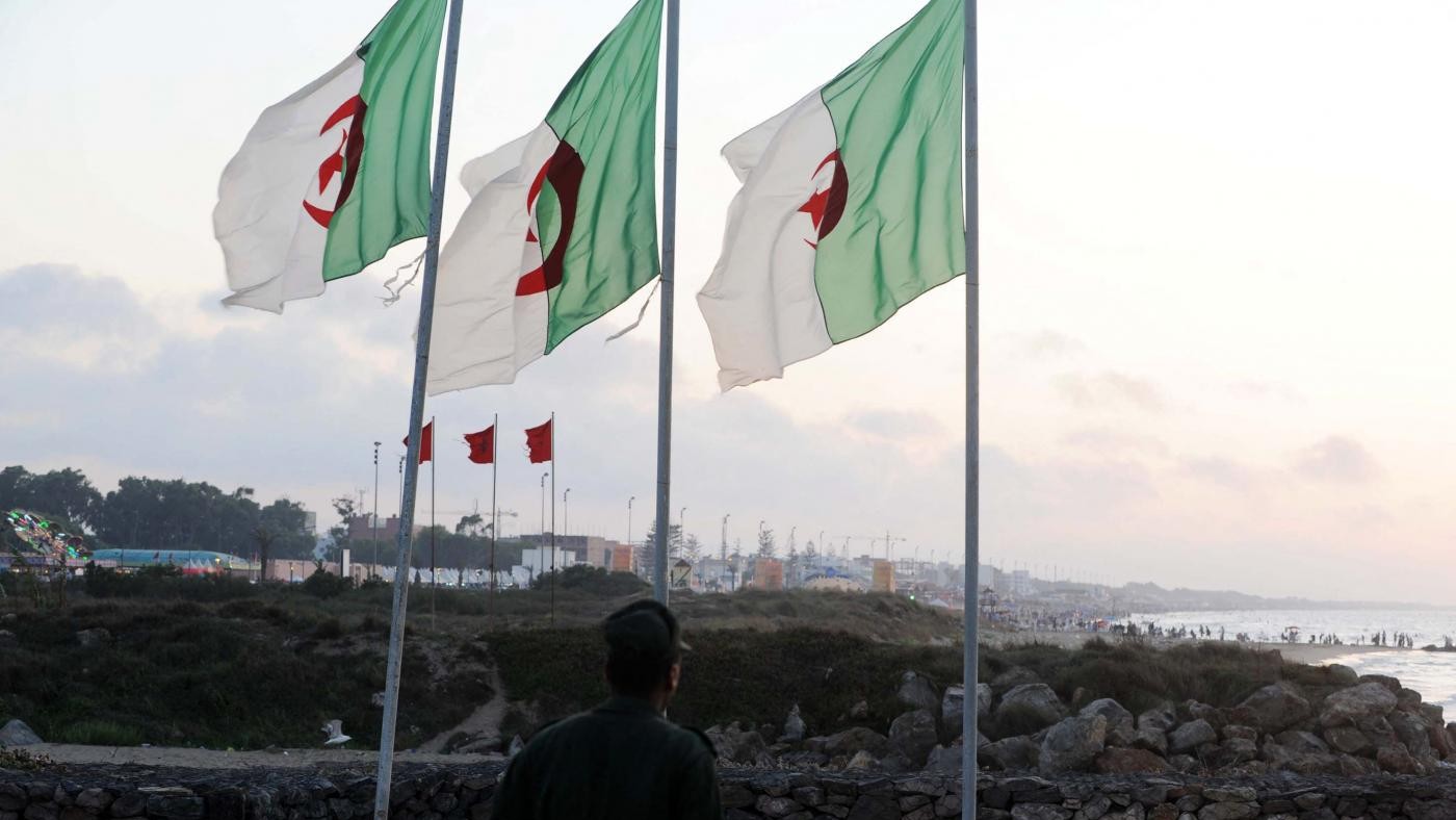 A soldier walks on the Algerian side of the Algeria-Morocco border as Algerian flags sway in the wind (AFP/File Photo)