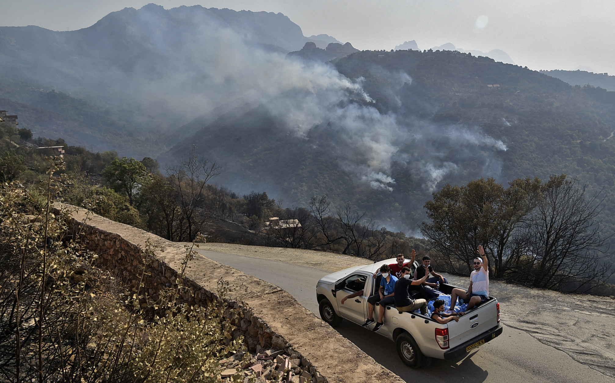 Algerian sitting alongside belongings in the back of a pick up truck gesture in greeting as they drive across from forest fires, in the Ait Daoud area of northern Algeria, on August 13, 2021 (AFP)