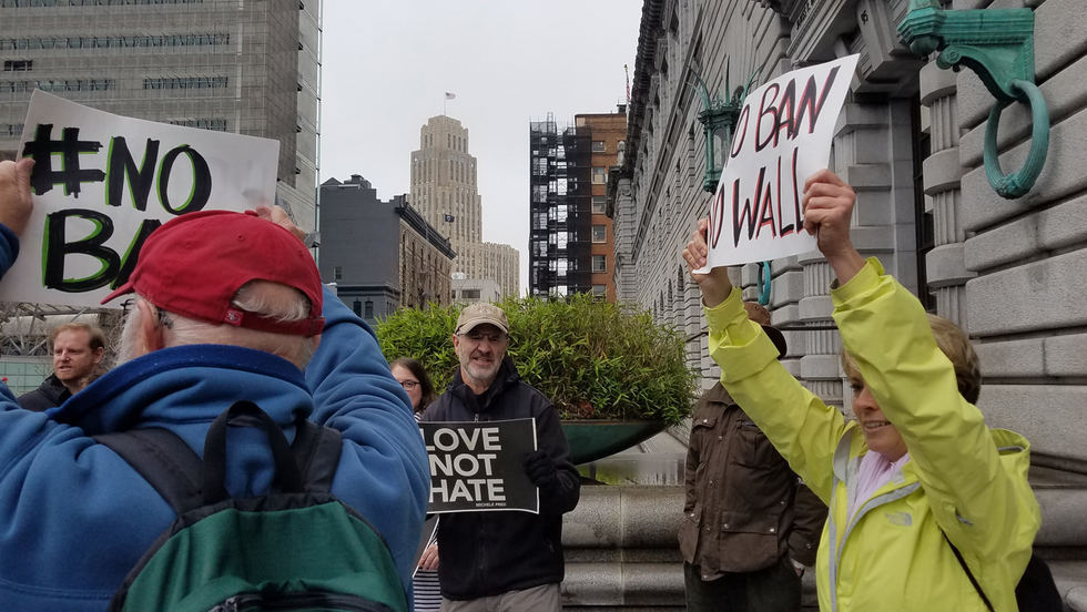 “I don't think it's fair to say San Franciscans don't care about what is going on, I think we care a great deal. Look at the turnout for the airport protest, thousands showed up, but it was a Saturday,” Brad Taylor, who waved a No Ban No Wall sign, said.