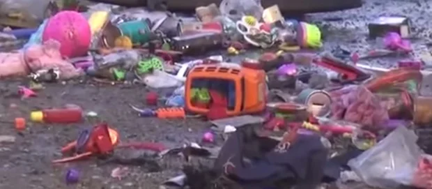 Colourful children’s toys are shown scattered on the ground as smoke billows from a line of six unrecognisably burnt-out cars and trucks.