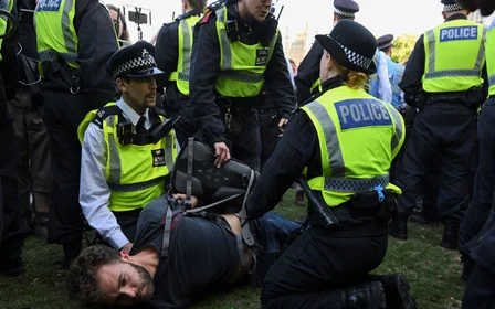 Middle East Eye also saw officers reading a pre-prepared statement while arresting protesters, stating that they were detaining them on "suspicion that you are a member or supporter of the proscribed group Palestine Action".