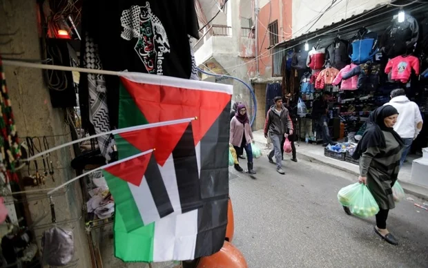 Palestinian flags on sale in a street in the Burj al-Barajneh camp in a southern suburb of Beirut (AFP)