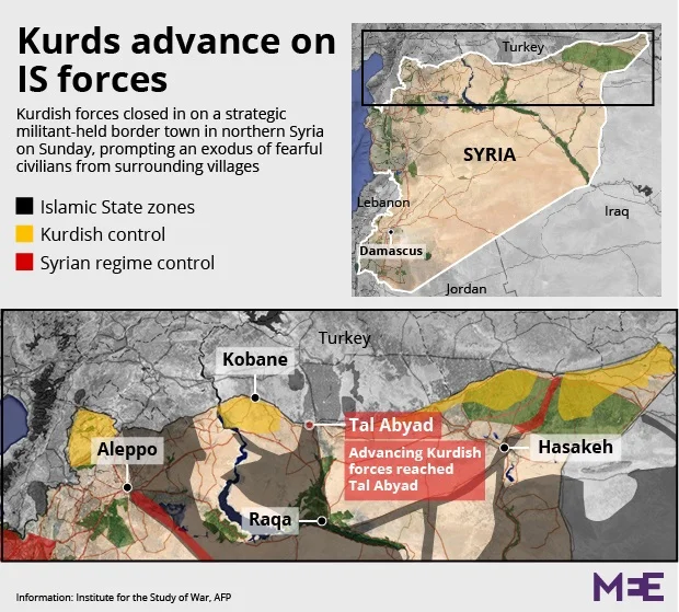 Kurdish forces on Monday cut off the group’s main supply lines from Turkey and are now in the heart of the IS-held border town of Tal Abyad, which fell to IS a year ago but has been under the control of the rival al-Nusra Front and Ahrar al-Sham since 2013.