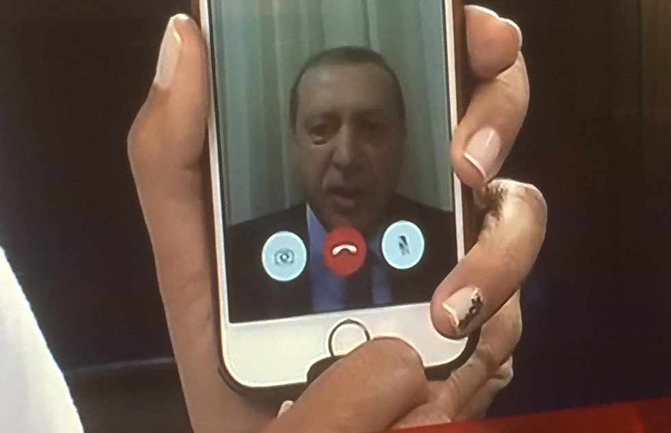 On CNN Turk, a telephone was held to the camera by the presenter, a lapel microphone pressed close to the speaker, and Erdogan's face came into focus. FaceTime with Erdogan was under way.