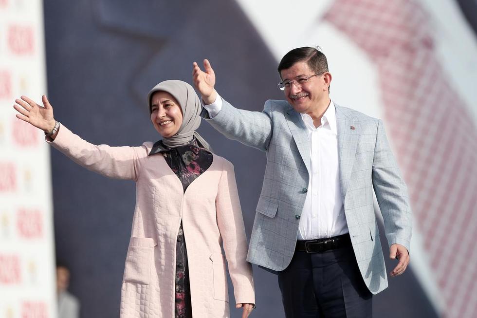 Turkey's Prime Minister Ahmet Davutoglu and his wife Sare Davutoglu greet the crowd during an election rally in Istanbul, Turkey on 17 May 2015 (AA)