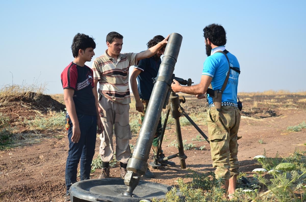 Members of Syrian opposition group linked to Damascus Front (Shamiyya Front) prepare to launch a rocket towards IS militants in Marea district of Aleppo, Syria on 7 August 2015 (AA)