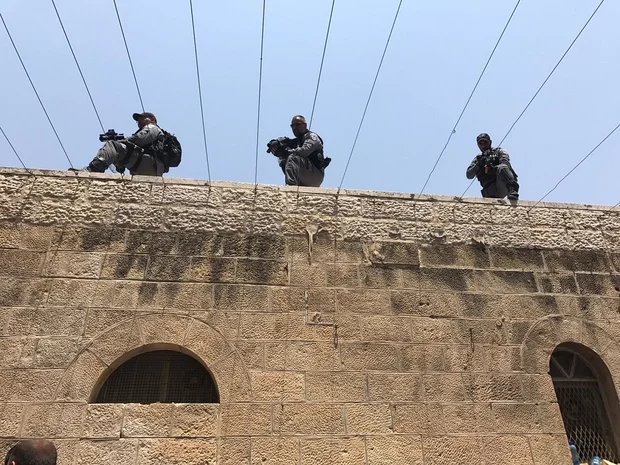 Israel poured thousands of extra police into the city in response. Police were seen taking up positions above crowds of worshippers, armed with baton rounds and assault rifles.