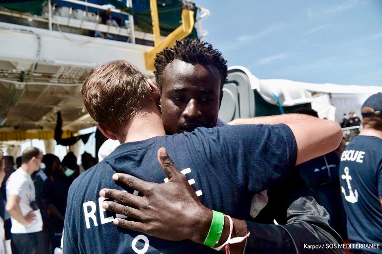 Under blue skies, migrants danced and sang, their excitement captured in footage released on Twitter by SOS Mediterranee which operates the rescue vessel with Doctors Without Borders (MSF).