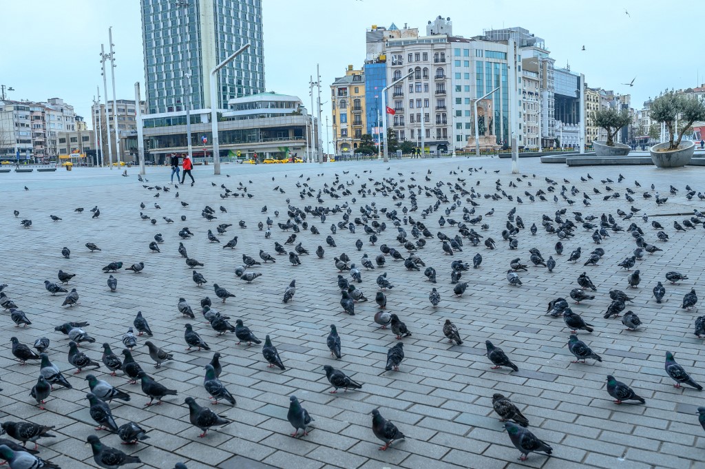 Pigeons gather at Istanbul's iconic Taksim Square, deserted due to the novel coronavirus outbreak (AFP)