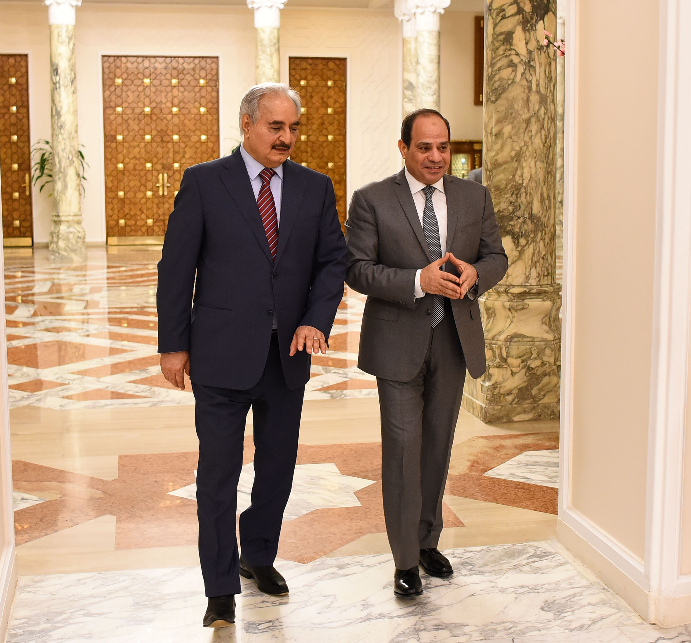 Egyptian President Abdel Fattah al-Sisi meeting with Libyan rebel commander Khalifa Haftar (L) at the presidential palace in Cairo on 9 May 2019 (AFP)
