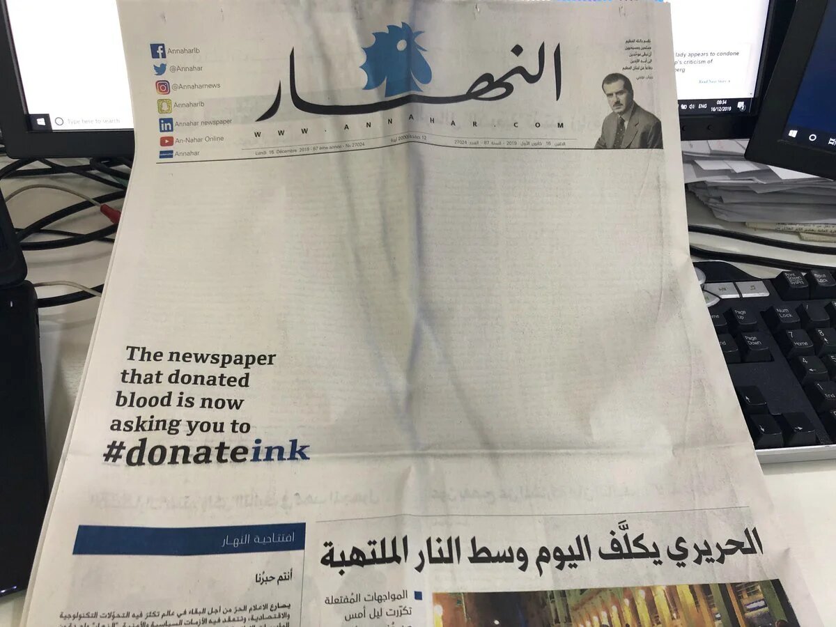 Lebanese newspaper An-Nahar surprised its readers in its Monday issue with a half-blank front page calling for donations to “support the continuation” of the newspaper.