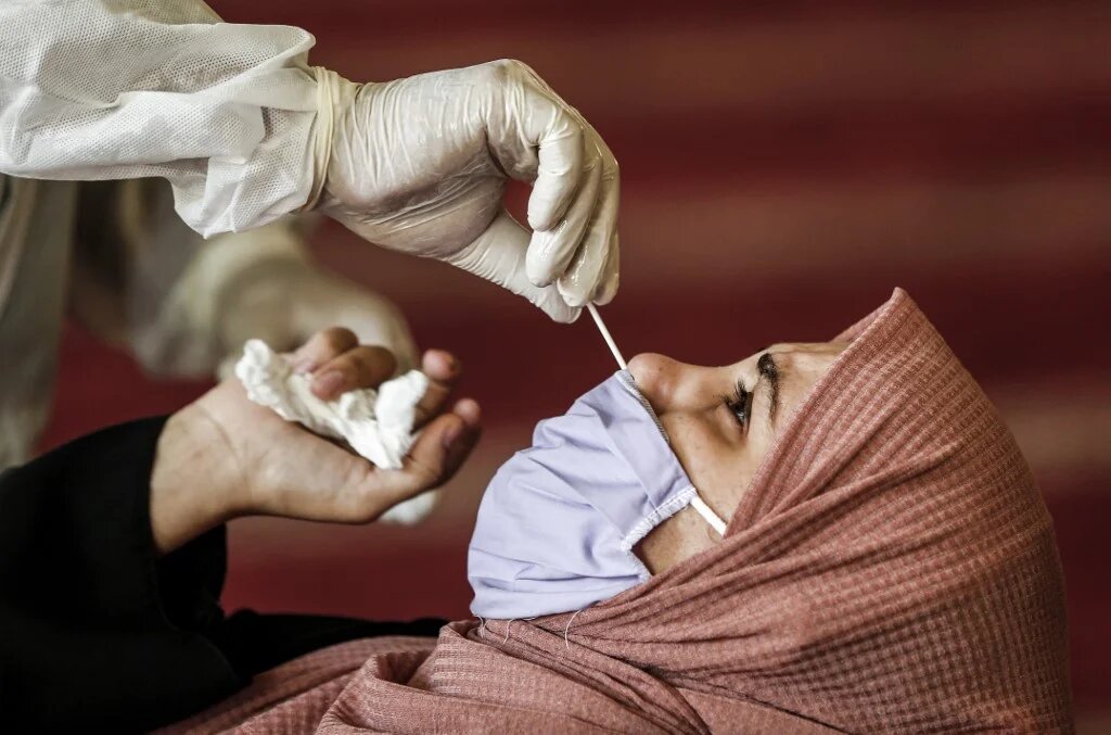 A Palestinian medical worker performs a Covid-19 test on a woman at a mosque in Gaza City on 20 September 2020