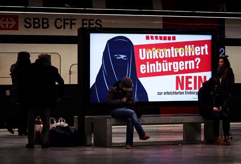 People walk by electoral posters of the committee against the facilitated naturalization reading "Uncontrolled Naturalisation? No" in Switzerland (AFP)