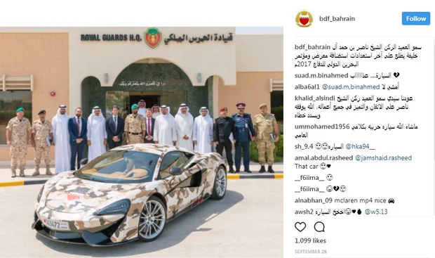 McLaren, the British car company, recently gifted Sheikh Nasser bin Hamad al-Khalifa, commander of Bahrain’s Royal Guard, and chairman of BIDEC, a sports car wrapped in military camouflage, to commemorate the opening of the arms fair.