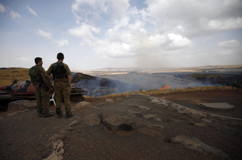 Israeli soldiers watch as fire rages at a settlement in the Golan Heights (AFP)