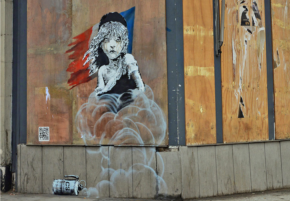 Next to the mural there is a code that if scanned by a mobile phone directs the viewer to a seven minute video of French police using tear gas and rubber bullets against refugee camps in Calais on 5 January.
