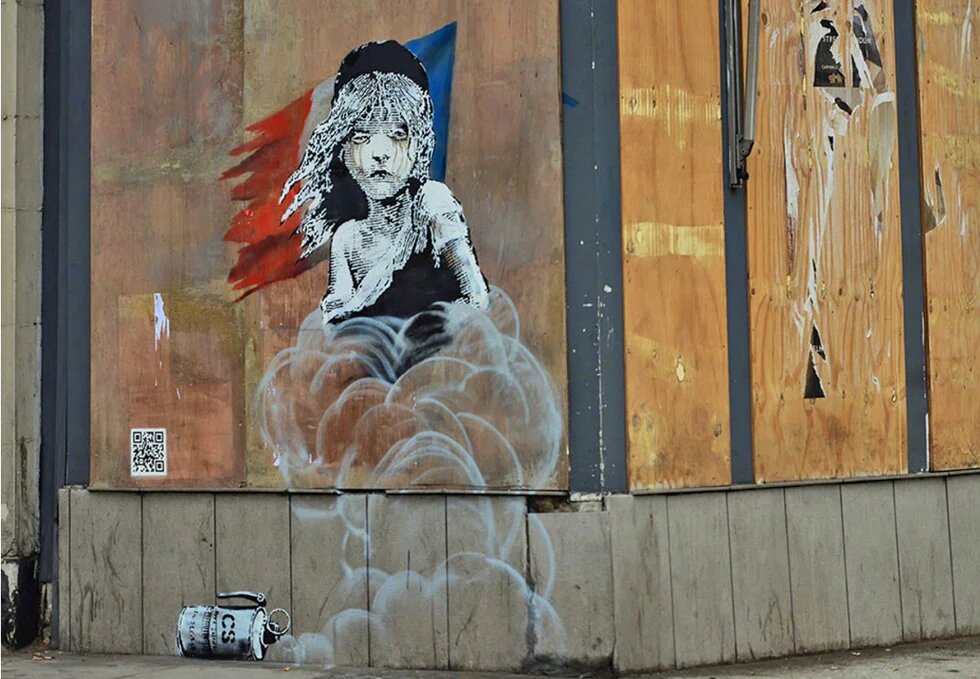 The artwork appeared on Sunday evening in London’s Knightsbridge and features an iconic image of a young girl from the musical Les Miserables with tears in her eyes as tear gas billows towards her.