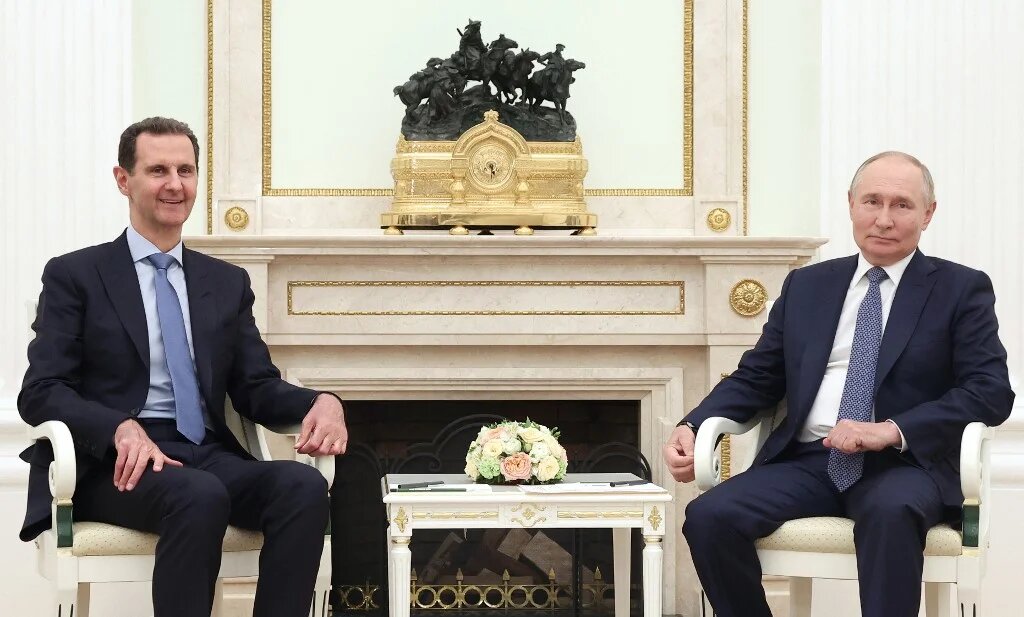 In this pool photograph distributed by the Russian state agency Sputnik on July 25, 2024, Russia's President Vladimir Putin (R) meets with Syria's President Bashar al-Assad at the Kremlin in Moscow on July 24, 2024 (Valery Sharifulin / Pool / AFP)