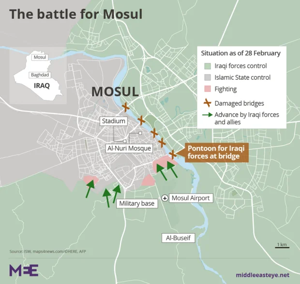Iraqi forces captured the eastern side of Mosul in January after 100 days of fighting and launched their attack on the districts that lie west of the Tigris river on 19 February.
