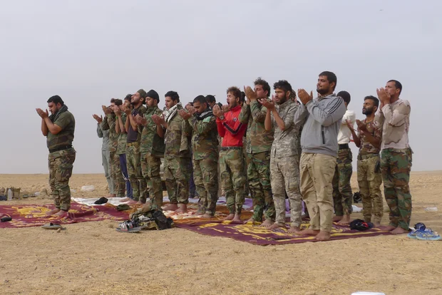 Soldiers take a break from the fighting to pray (MEE/Tom Westcott)