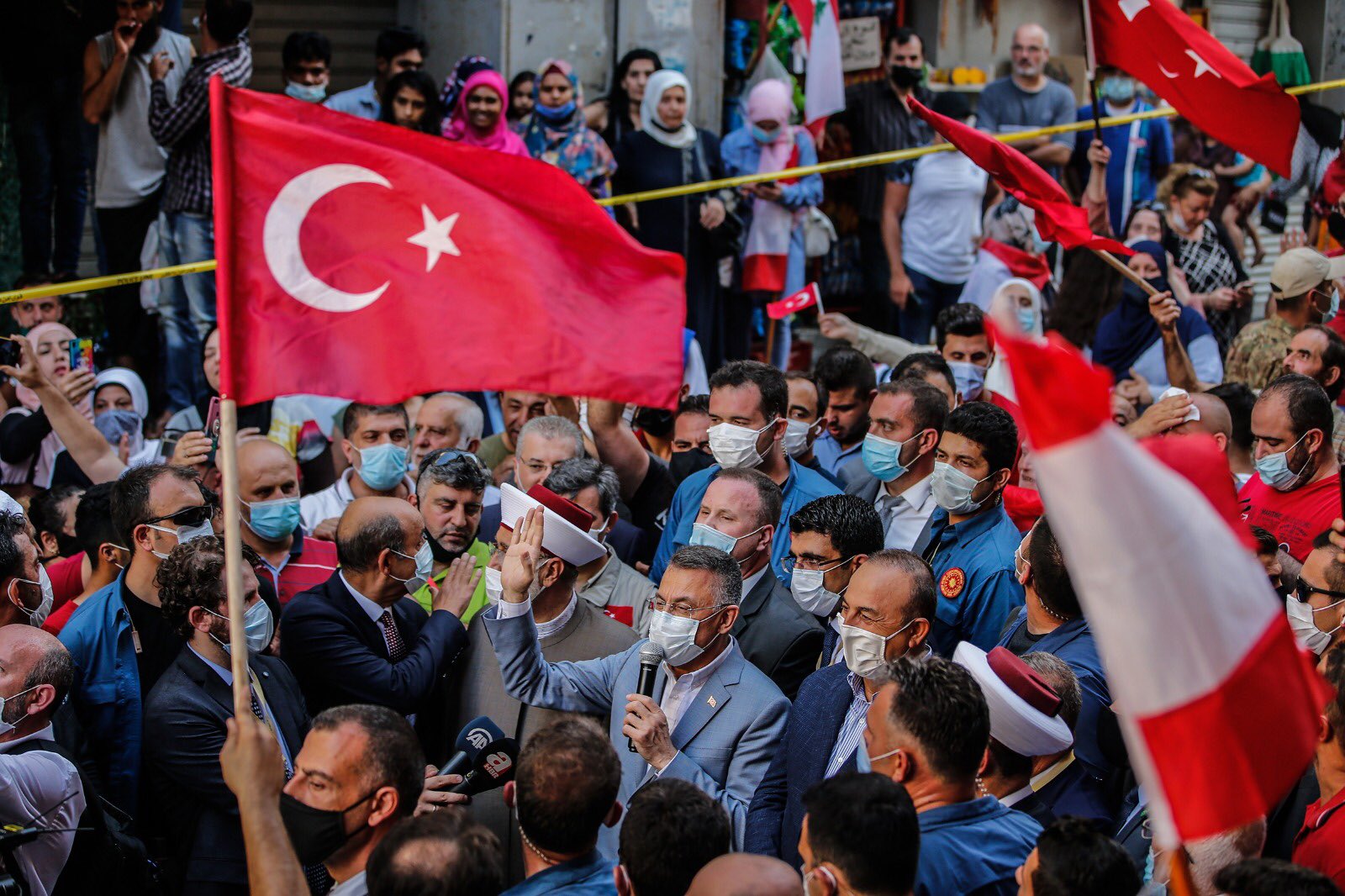 Both Oktay and Cavusoglu visited a neighbourhood in Beirut which is populated by Lebanese citizens with Turkish or Turkmen origins. They were welcomed by hundreds carrying Turkish flags, mirroring the crowds accompanied Macron.