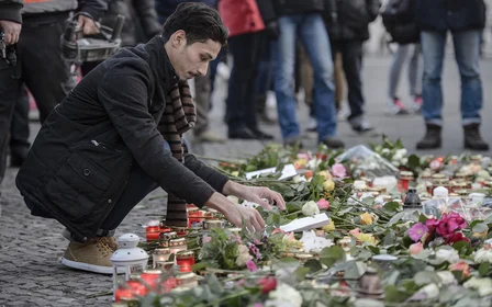 Organisers said they would dim the lights and tone down the Christmas music but begin serving mulled wine and open the traditional market huts, as Berliners left a sea of flowers and candles at the site in honour of the victims.