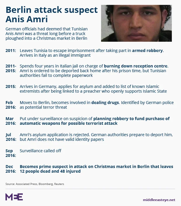 Amri had served four years in jail in Italy for violent crimes and theft before entering Germany in July 2015. He had been added to Germany's central terrorism watchlist in January and lost his claim for asylum in June but was not deported to Tunisia.