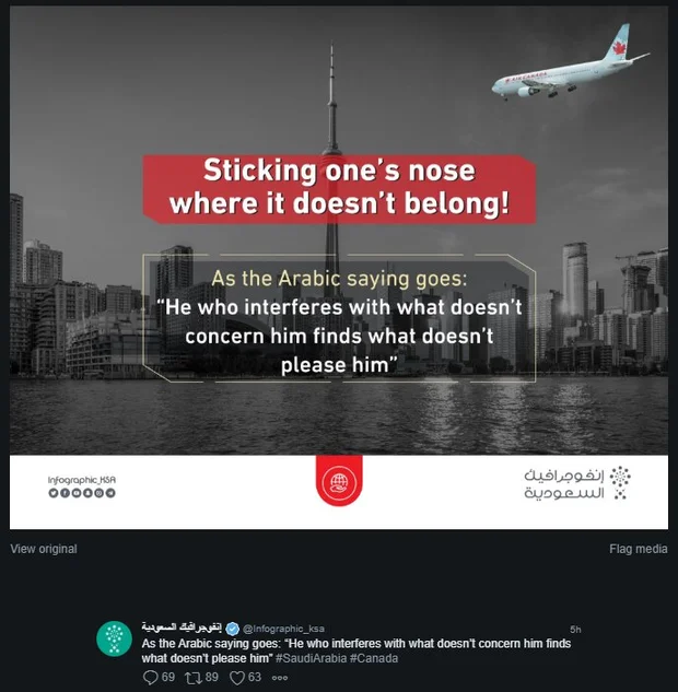 Shortly after the spat began, the twitter account KSA Infographics tweeted an image with a caption reading "Sticking one's nose where it doesn't belong!" and a picture of an Air Canada plane heading towards the CN Tower in Toronto: