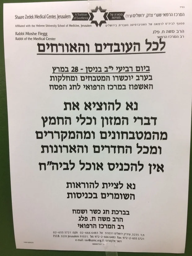 A few days ahead of Passover, notes were pinned in Shaare Zedek Hospital in West Jerusalem telling visitors and employees that, beginning on Wednesday 28 March, "all food coming from outside" would not be allowed into the hospital for the duration of Passover, and asking for all leavened food to be taken from hospital rooms, kitchens, fridges, and closets.