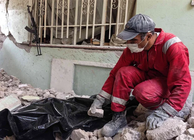 A few days later, Omar was working in a nearby street with a group of civil defence workers. They had managed to extract five of his family members from the rubble, he says, but three were impossible to retrieve by hand.