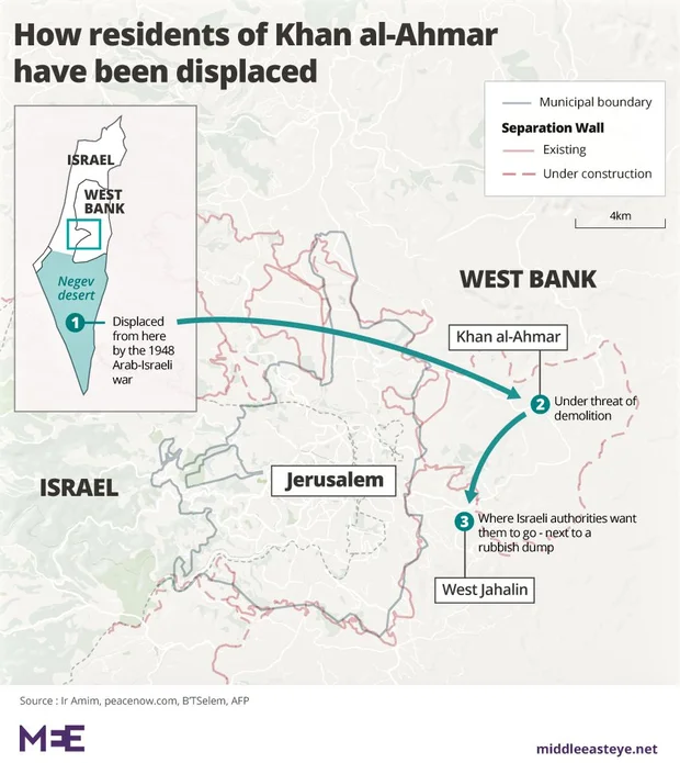 Khan al-Ahmar is located between the Israeli settlements of Maale Adumim and Kfar Adumim in the occupied West Bank, and has been a home for Bedouin since the 1950s. It has been at risk of demolition since 2010 after Israeli authorities accused the estimated 200 residents of illegal construction.Residents have rejected a government offer to rehouse them to West Jahalin, near the Palestinian community of Abu Dis, saying that the new site is adjacent to a landfill. Rights advocates say that a forcible transfer of the residents would violate the international laws that apply to occupied territories.