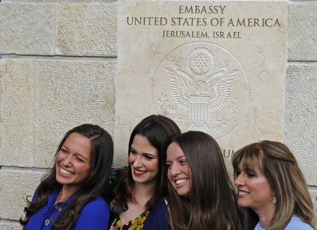 Women pose for photos during the US embassy in Jerusalem on Monday (AFP)