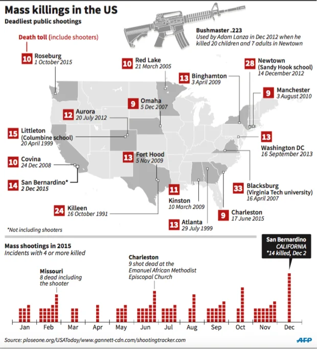 The killing is the deadliest mass shooting in the United States since the Sandy Hook Elementary School massacre three years ago when 20-year-old Adam Lanza fatally shot 20 children and six adult staff members.