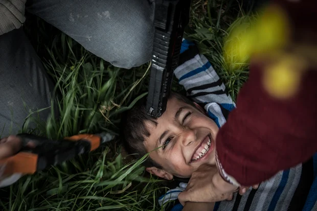 “Allahu Akbar,” shouts one of them as he presses his plastic gun to a friend’s forehead. Metres away from the battlefield, two teens armed with a wheelbarrow come and go, loaded with construction material. They want to expand their home.