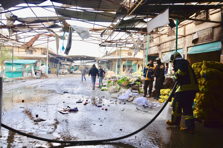 Shopkeepers and workers at the vegetable market were trying to collect their scattered livelihoods, including Yusuf Ajbou, 14, who told MME: “I work here in this shop, which was destroyed. Fortunately, I was with friends unloading vegetables in another shop. I came back here after the blast to help clean up and found that many of my neighbours were killed or wounded.”