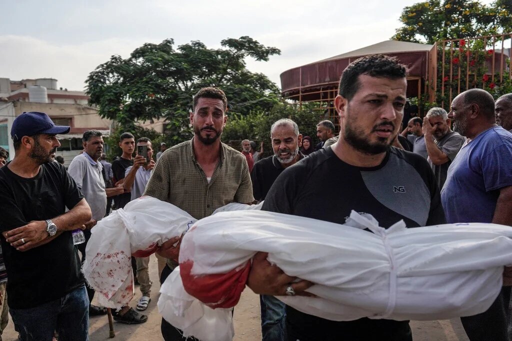 Mourners carry the bodies of six members of the Qadih family to a burial ground in Khuzaa, southern Gaza Strip, after an Israeli strike on their home in Bani Suheila on 21 July 2024 (Bashar Taleb / AFP)