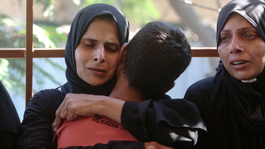 A woman hugs a child after identifying the body of a family member at the Nasser hospital, among Palestinians killed in Israeli strikes on the al-Mawasi refugee camp and the eastern neighbourhoods of Khan Younis, on 24 July 2025 (AFP)