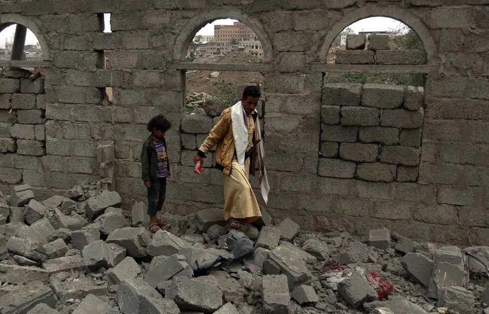 Yemenis walk in the rubble of a house in Sanaa after it was hit by a Saudi-led coalition air strike (AFP)