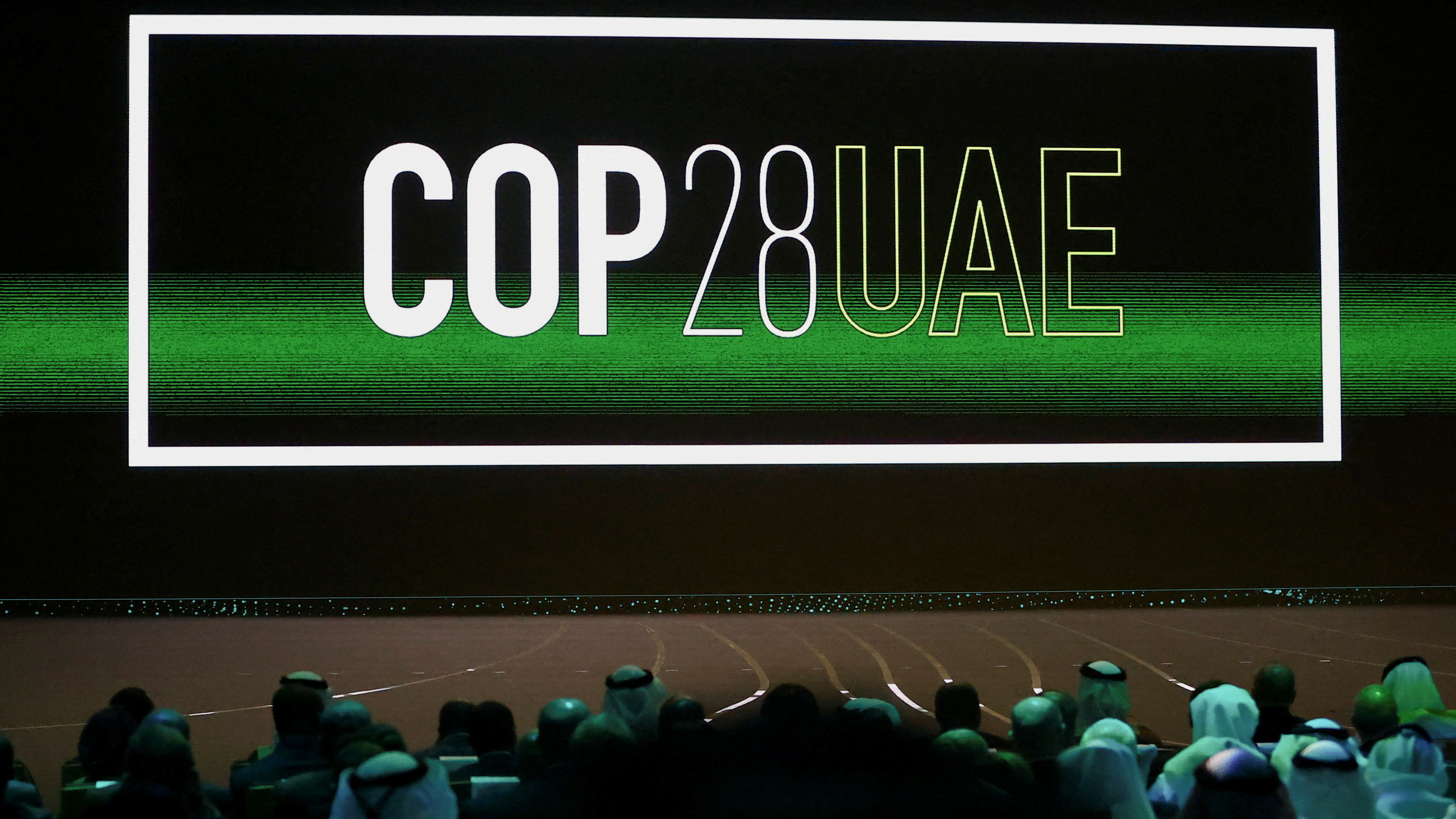 The Cop28 UAE logo is displayed on the screen during the opening ceremony of Abu Dhabi Sustainability Week (ADSW) in Abu Dhabi on 16 January 2023 (Reuters)