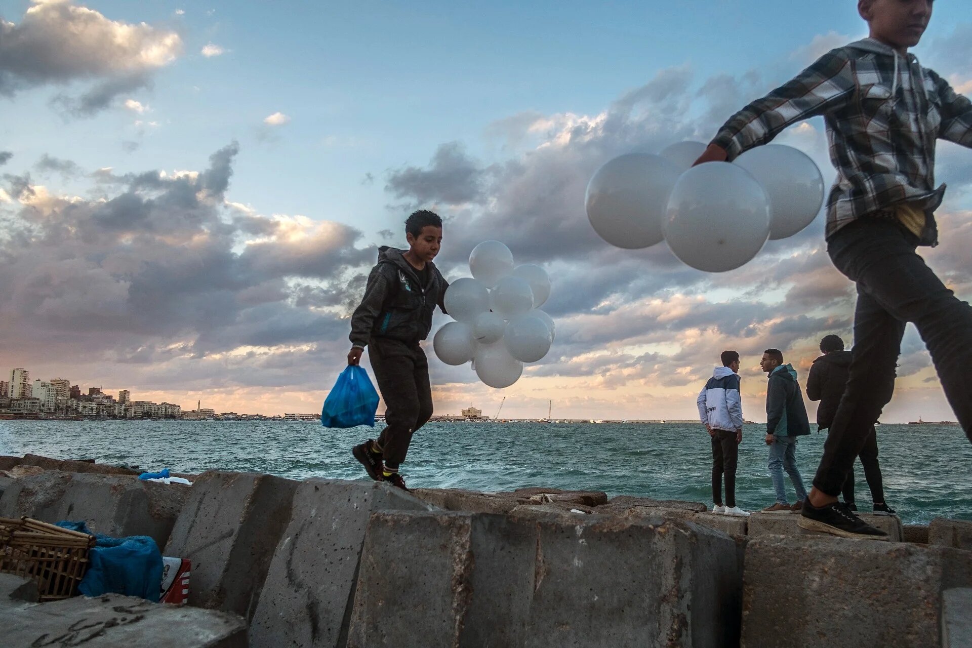 Boys walk while holding balloons on concrete blocks by the Mediterranean waterfront in the historic harbour of Egypt's northern city of Alexandria (AFP)
