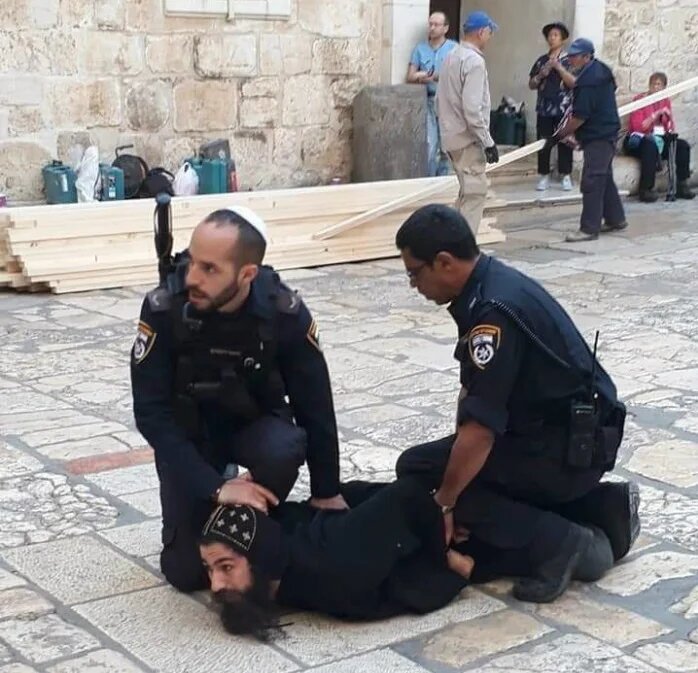 One monk, Macarius Orshalemy, was dragged and pinned to the ground by the military police at the protest, while others were struck with batons as they sought to obstruct workers from Israel's Antiquity Authority moving restoration materials and tools inside.
