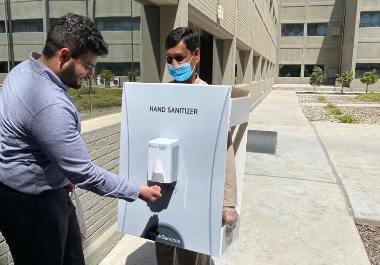 According to several photos that went viral late on Tuesday, a worker wearing a mask and a box that dispenses hand sanitiser can be seen approaching staff in the lobby and outside perimeter of one of the oil behemoth's buildings.