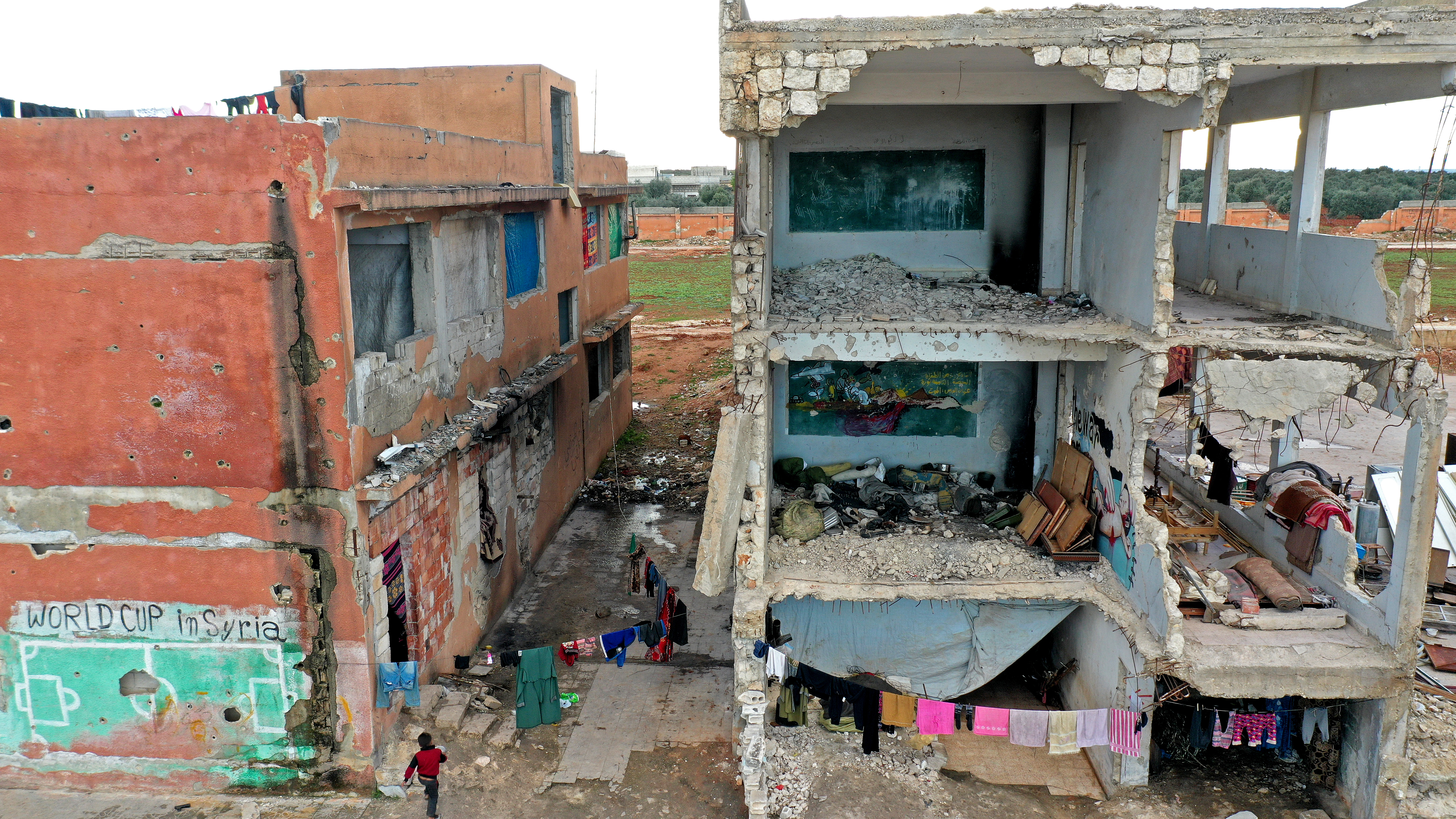 Displaced families inhabit a school building heavily damaged by previous bombings in the rebel-held town of Binnish in Syria's northwestern Idlib province, 1 April 2020 (AFP)