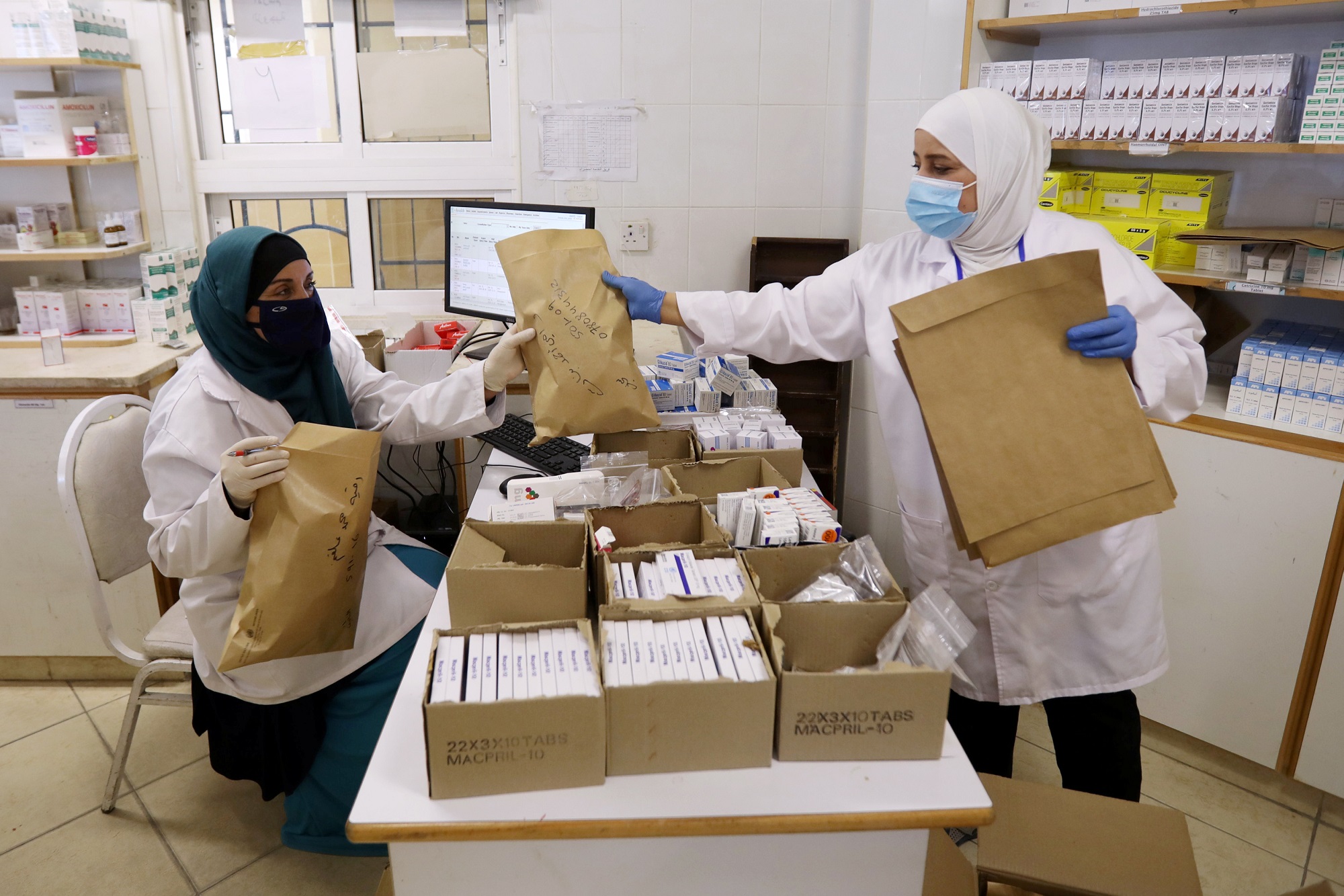 UNRWA staff prepare medicine to deliver to Palestinian refugees at Al-Wehdat camp in Amman, 15 April (Reuters/File photo)