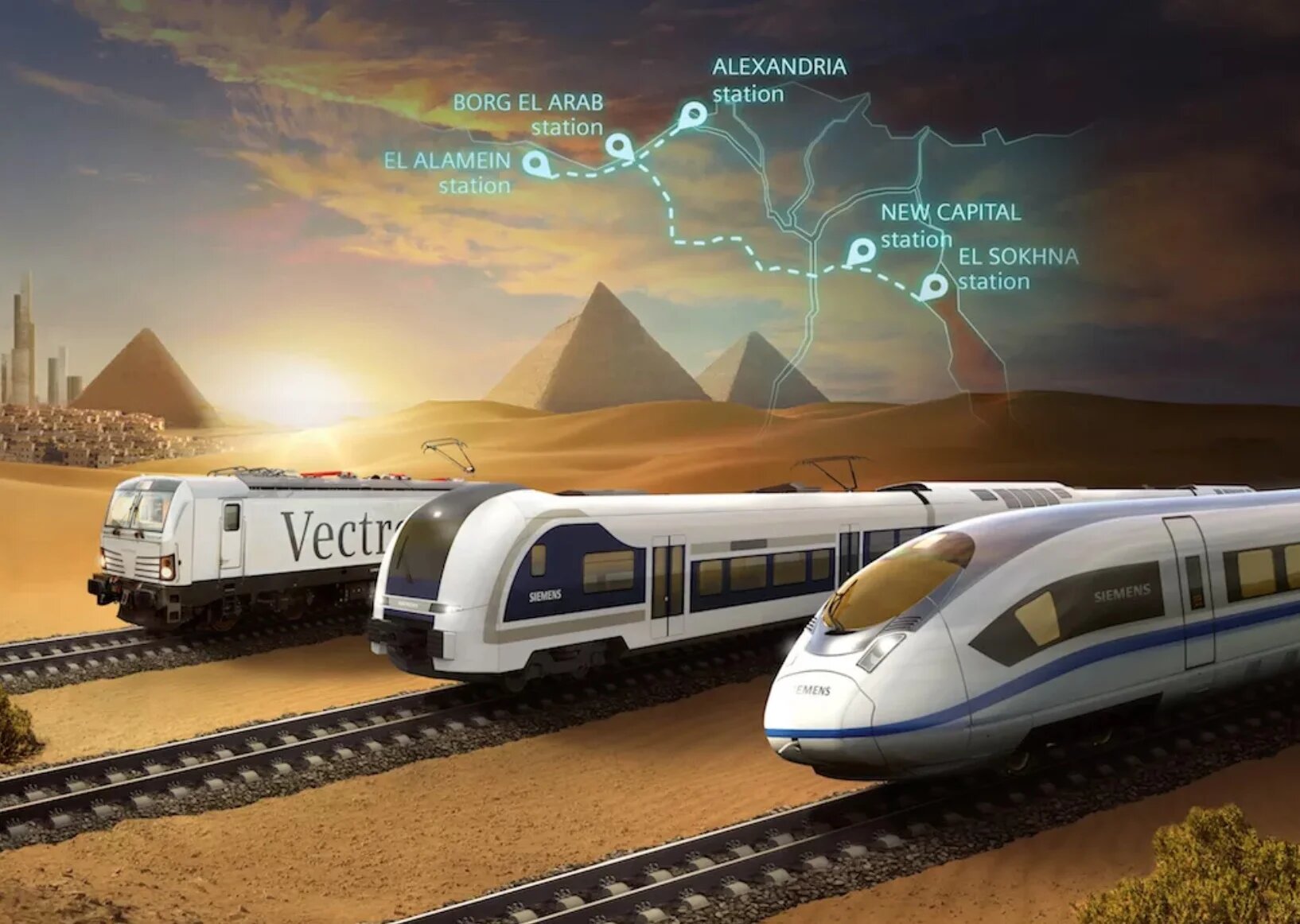 Running 460km from al-Ain al-Sokhna on the Red Sea coast to al-Alamein on the Mediterranean, trains will reach speeds of 250km/h.