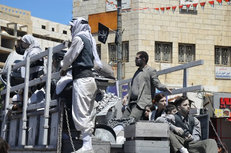 A freshly painted grey pick-up truck arrived in the square carrying men, women and children painted grey, and wearing black, white and grey - like ghosts from the past, simulating the flight of refugees from their homelands.