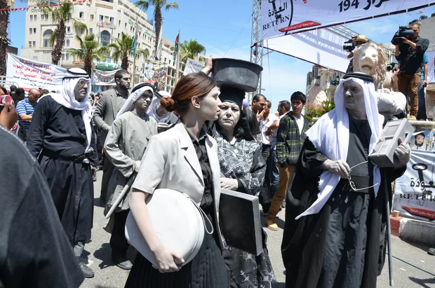 RAMALLAH - Palestinians packed into central Ramallah on Thursday, among thousands who demonstrated in the West Bank and East Jerusalem on Thursday to mark the 66th anniversary of the Nakba.