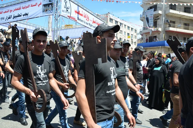 A group of Palestinian youth wearing black T-shirts printed with 1948 and “return”, carried giant keys and held a large Palestinian flag as they marched through the square.